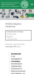 This online resource, titled "БЕЛАВТОМАТИКАСЕРВИС" (zaobelas.by), is a website for a closed joint-stock company (ZAO) offering services for the verification and repair of temperature and gas flow meters, pressure and temperature gauges, water meters, gas meters, flow meters, and gas analyzers. The company has its own certified testing complex and provides quality repair and maintenance services. The website states that services are available for both legal entities and individuals, Monday to Friday from 9:00 to 16:00, with a lunch break from 12:00 to 13:00. The company also works with transportation companies like AutoLight and DPD. The website notes that inspections for manometers and thermometers (glass and bimetallic) are carried out with