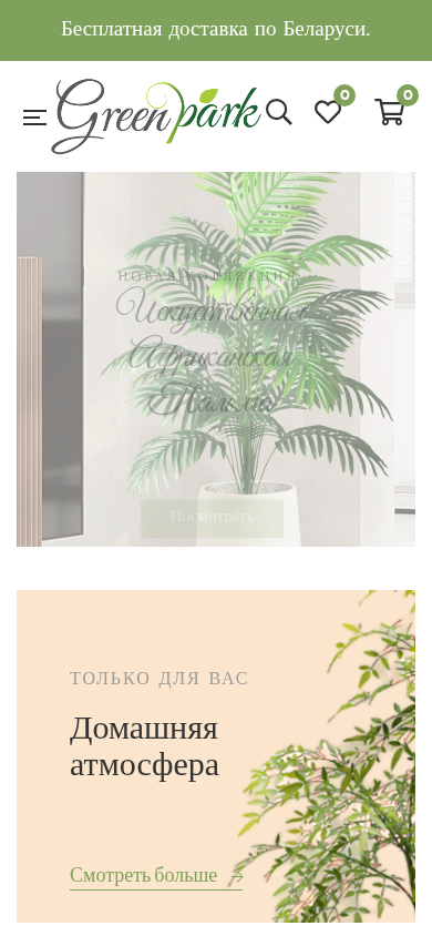 | AI-анализ | The web project "GreenPark" is an online shop offering a wide range of high-quality artificial plants that closely resemble real ones. The selection includes decorative trees, flowers, palms, succulents, and more, making it an ideal choice for home, office, or commercial spaces. The website provides free shipping in Belarus and features a buyer's catalog, order processing, payment and delivery information, a care guide, return policy, privacy policy, blog, and contacts. Popular items include an artificial African palm, olive tree, snake tree, and various collections for home atmosphere enhancement, such as artificial palms, plants for entryways, and a choice for plant lovers. The website features a cart, wish list, and individual product pages with prices, initial prices, and current discounted prices. The website also emphasizes that artificial plants can improve mood and reduce stress, making them a practical and stylish addition to |
