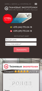 | AI-анализ | This online resource is dedicated to selling and installing cloth stretch ceilings (tentative translation: tkaневые натяжные потолки) in Minsk, Belarus. The offered brands are CLIPSO (Клипсо) and DESCOR (Дескор). The website provides information on the montage and installation of the stretch ceilings, as well as the realization of suspended ceiling-wall systems and their components. The top_words data indicates that the phone numbers for contacting the company are +375 (29) 772-24-18 and +375 (44) 772-24-18, and the addresses are given as 220103, g. MINSK, ul. KNORINA, 55. The stretch ceilings are made of |