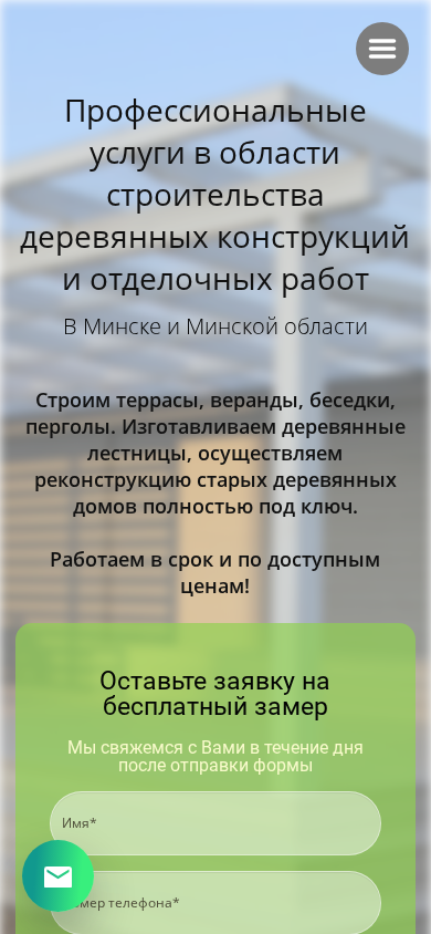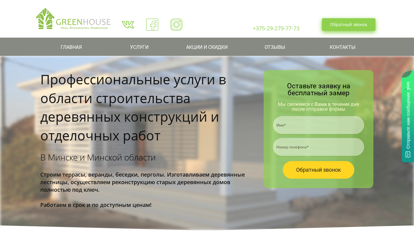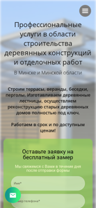 | AI-анализ | --- The portal Green House Minsk is a construction company offering comprehensive solutions for building projects in the countryside. They specialize in the production of terraces, gazebos, and canopies. The contact information is provided, including a phone number for those interested to leave their number for a callback. The company promises to adhere to regulations and seek consent for data processing. Services include the construction of wooden structures and renovation of old wooden houses, all carried out efficiently and affordably. Potential clients can submit a request for a free measurement. The company has been active in the construction market since 2014 and boasts a team of experienced designers, constructors, and installers. Their goal is to provide top-quality and comprehensive building and home improvement services. The company offers terraces, gazebos, wooden stairs, decorative railings, house renovations, and more. The advantages of working with them include the |