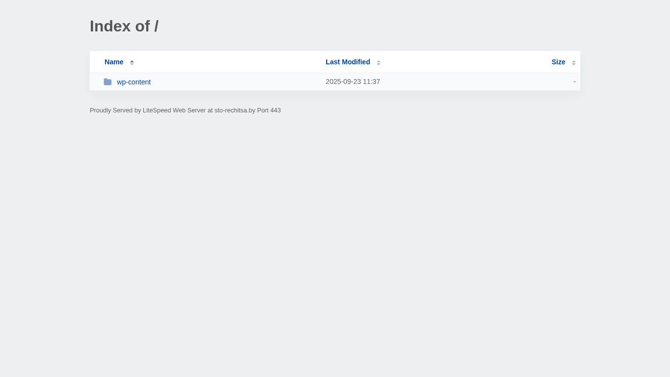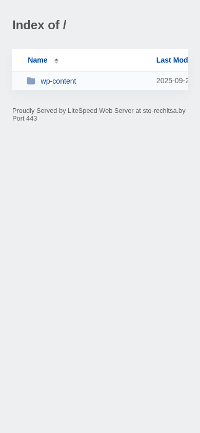 | AI-анализ | The portal sto-rechitsa.by is a website with an index page showing a list of files and directories, including the 'wp-content' folder, last modified on September 23, 2025. The site is proudly served by the LiteSpeed Web Server and can be accessed through port 443. |