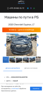 | AI-анализ | The web project "Usauto.by" is an e-commerce platform that specializes in importing and selling used cars from the United States to Belarus. It offers assistance in selecting, transporting, and registering vehicles from American auctions, with competitive prices and full support throughout the transaction process. The website features detailed information about the available cars, including their make, model, body style, year, price, engine specifications, and mileage. The cars' condition is listed as "on the way to Belarus" or "in transit," with details about their current location, condition, and damage history. The site also contains a contact email address and a phone number for inquiries. |