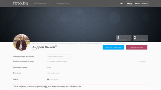 | AI-анализ | The website is a photography portfolio by Belarusian photographer Andrey Lыkov from Minsk. It specializes in wedding photography, as well as family and event photography. The website provides information about the photographer's services and pricing, which includes an eight-hour shooting day for 750 rubles, and mentions the coverage area as Minsk. The portfolio showcases various wedding, family, and event photographs in the gallery section. The website also includes contact information, with a phone number and a personal website link. |
