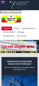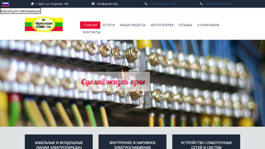| AI-анализ | The website belongs to Брестская СПМК-14, a company based in Brest, Belarus, located at ul. Я.Купалы 108. The website offers professional electrical mounting services, including low-voltage works, fire prevention, cable and air line installation for electric power transmission, as well as security alarm systems and video surveillance. Keywords associated with the website include electrical mounting, low-voltage works, fire prevention, cable and air line installation, electric power transmission, security alarm systems, and video surveillance. The top words in the website include numbers 375 and 162, as well as the names of several countries and languages. The website includes information on the company's services, objects, photo gallery, reviews, company profile, contacts, and a section on making life brighter. The company has been working in the market for over |
