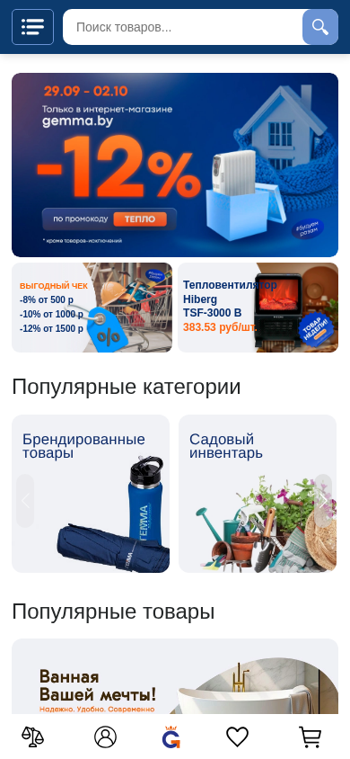 | AI-анализ | language: ru country_code: BY This online resource is a building materials store named Gemma, located in Grodno, Belarus. The website offers a wide range of products for home, cottage, and garden use, including building materials, sanitary ware, paint, floor and wall coverings, tiles, roofing materials, heating equipment, electrical appliances, leather and carpentry items, and fasteners. The website features a catalog with prices and detailed product specifications. The store offers discounts and various methods of payment and delivery. Popular product categories include branded items, garden tools, household appliances, and electrical tools. The website provides contacts for customer service and information about promotions and discounts. The top products in the shopping cart include a Hiberg TSF-3000 B thermo ventilator, a Monogramma Metropol blue bag with the Gemma logo |