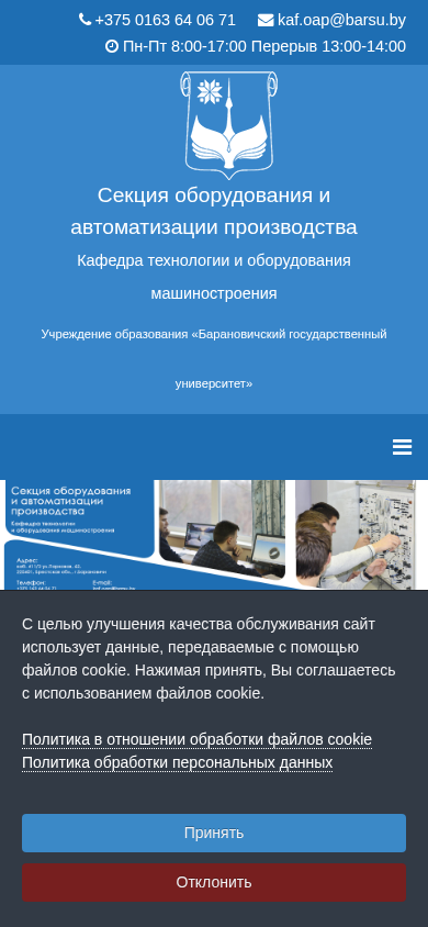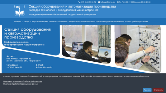 | AI-анализ | The web project "Section of Equipment and Automation in Machinery Production" of the "Technology and Equipment of Machinery Engineering" Department at the "Baranovich State University" offers detailed information about the section, including its staff, class schedules, research and innovation initiatives, student research club, news and announcements, material and technical resources, laboratory information, and information about its branches. The website provides information on various events such as competitions, seminars, and workshops, as well as the address, phone number, and email of the department head. The site is available from 2013 to present and is currently open for classes from Monday to Friday, 8:00-17:00 with a break from 13:00-14:00. Visitors can check the availability of the teaching staff and the schedule of open classes. The website is operated by the |