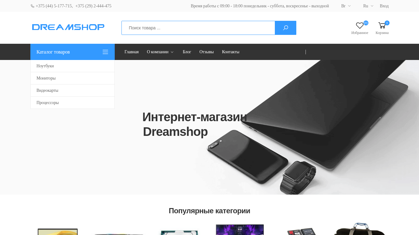 | AI-анализ | This online resource is a Belarusian e-commerce website named "Dreamshop," with the home page title "Интернет-магазин Dreamshop" and a description that translates to "Online Shop Dreamshop." The top keywords include the website's name, "интернет-магазин" (online shop), "поиск" (search), and various product categories like "ноутбуки" (laptops), "мониторы" (monitors), and "видеокарты" (video cards). The website offers services, has a category list, and mentions delivery and payment. The phone numbers for customer support are 375 (44) 5-177-715 and 375 (29) 2-444-475. The business operates from Monday to |