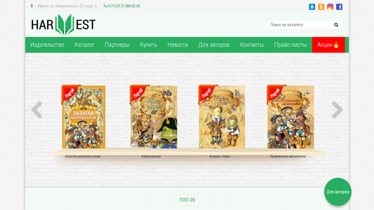 | AI-анализ | --- The portal Harvest.minsk.by is an online publishing house and bookstore based in Minsk, Belarus. Its physical address is Ul. Kalinovskogo 57, корп. 2. The company offers various promotions and discounts on its books, which can be found in multiple bookstores and online shopping malls such as "Корона," "Буслик," and "Белкнига." The catalog features a top 20 list of new releases, price lists, and contact information. The website also includes sections for authors, news, and vacancies. Keywords related to the site include 'literature,' 'казкi,' 'сказки,' 'Харвест,' 'акции,' 'скидки,' 'сети,' 'магазинов,' 'книг,' 'заяц,' ' |