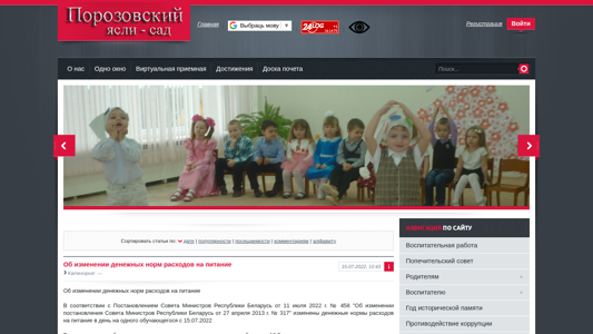 | AI-анализ | The portal "Порозовский ясли-сад" is a state educational institution. The website provides information on various topics, including news, achievements, and a honor roll. Users can sort articles by date, popularity, visits, or comments. There are several news articles, such as an update on financial norms for childcare, a safety alphabet in pictures, and a tribute to Belarusian land. The portal also offers information on adoption services and a family finder for children. The website is available in multiple languages and includes a virtual reception desk. |