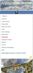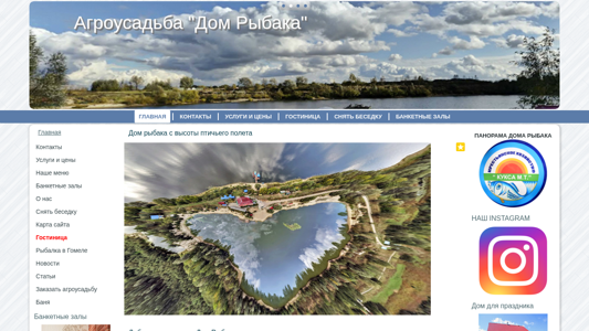The website DomRybaka.by is dedicated to an agroestate called "Dom Rybaka" located in Homel, Belarus. The estate offers various nature-based leisure activities, including fishing in a lake or the Sozh river. Services provided include renting a cabin for picnics with a provided grill and tables, water cruises on a catamaran, a sauna, renting banquet halls, and renting a guest house. The estate is situated near Homel, providing a picturesque view of the Sozh river and the city center on the opposite bank. The estate also hosts regular river tram rides. The website contains sections for services and prices, a menu, information about banquet halls, and details about renting cabins on the lake. The estate offers cabin rentals on the lake, each with 25 seats, equipped with grills,