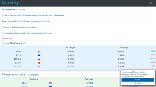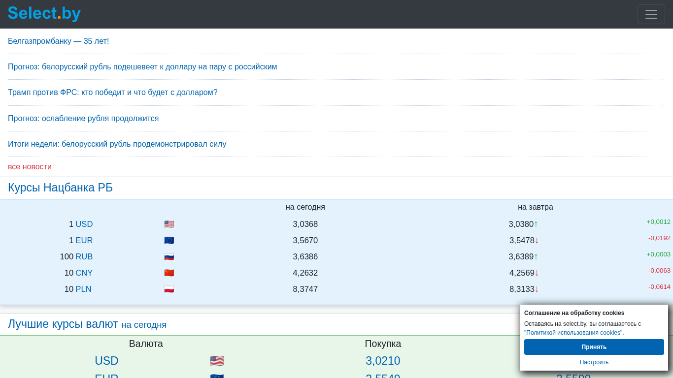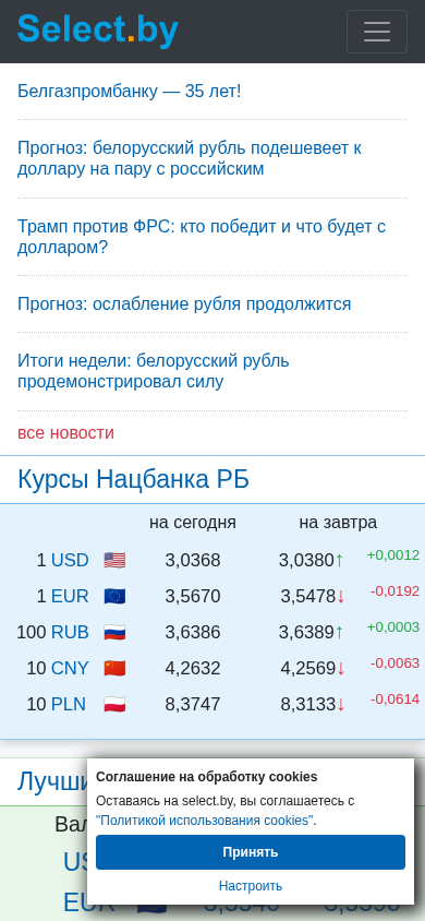 | AI-анализ | This website is a financial platform for Belarusian banks, providing information on credits, deposits, currency exchange rates, and banks in Minsk. The title is "ВСЕ БАНКИ БЕЛАРУСИ | Кредиты. Вклады. Курсы валют. Банки Минска," and the description includes keywords like "кредиты," "вклады," "депозиты," "лизинг," "Беларусь," "Минск," and "денежные переводы потребительские." The top words include "курсы," "все," "банки," "беларуси," "валют," and "новости." The website includes news on currency exchange rates, bank ratings, and banking trends in Belarus. Users can compare credit and deposit rates from |