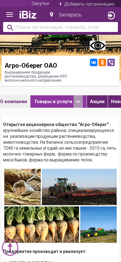 | AI-анализ | The web project "Agro-Obereg OAO" is a large agricultural enterprise specializing in the cultivation and sale of agricultural products, including plant farming and cattle breeding for milk and meat production. The organization owns 7240 hectares of land, with 5515 hectares dedicated to farming. It operates five dairy farms, a beef farm, and a farm for raising heifers. The enterprise produces and sells various crops such as cereals, legumes, rapeseed, sugar beets, and seed crops. It also provides livestock with feed, producing milk and meat from cows. With its own fleet of specialized and agricultural vehicles, including tractors, harvesters, spreading machines for mineral fertilizers, and cargo trucks, the organization ensures efficient operations. Agro-Obereg OAO continually increases its crop yields and productivity, modernizes |