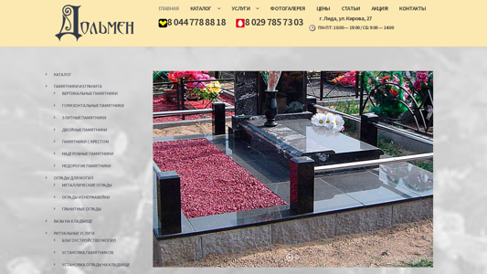 | SEO-описание | Мастерская dolmen.by предлагает купить памятники в Лиде на могилу с доставкой и установкой. Продажа памятников под ключ на заказ. Каталог содержит фото и цены. |