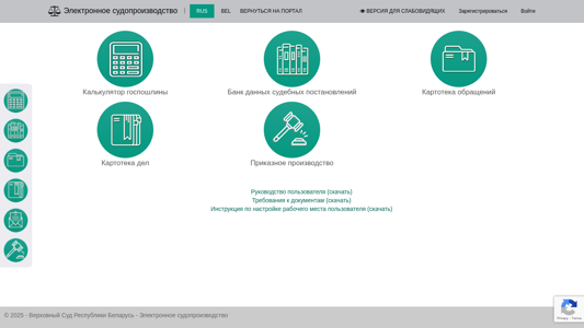 | AI-анализ | The web project "Электронное судопроизводство" (Electronic Judicial Proceedings) is a Belarusian .BY domain dedicated to electronic court proceedings. The website offers various services related to judicial proceedings, including a bank of judicial decisions, a case management system, and a calculator for court fees. Users can access a library of court rulings, manage their cases, and calculate fees associated with their legal proceedings. The site also features a notification system and a user manual for registration and setup. The project is operated by the Supreme Court of Belarus. |