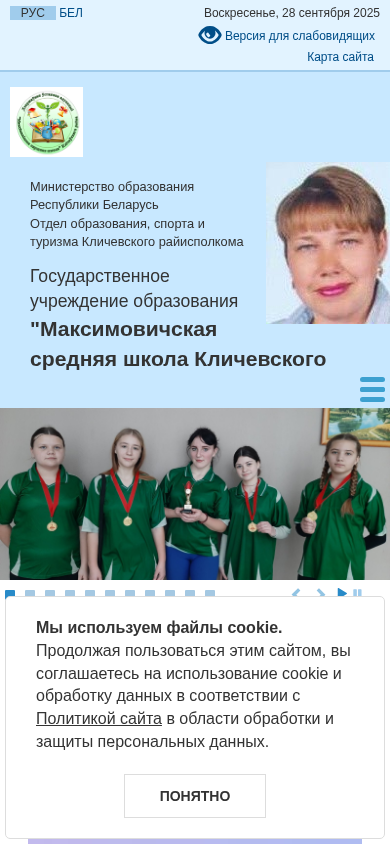 | AI-анализ | --- This online resource is the official website for Maximovich Secondary School in Klichevsky district, Belarus. The title is "Максимовичская средняя школа" and the description includes keywords such as "school", "education", "republic", and "учреждения" (institutions). The top words indicate that the site features news from the years 2023 and 2025, as well as information about safety for children. The site uses cookies and has a map of the Ministry of Education in the Republic of Belarus, as well as contact information for the school. Popular topics include academic advising, testing, and electronic textbooks. Financial literacy resources and information about school policies are also available. The site provides information about administration, faculty, and social-psychological services, as well as paid services and school production. Important documents |