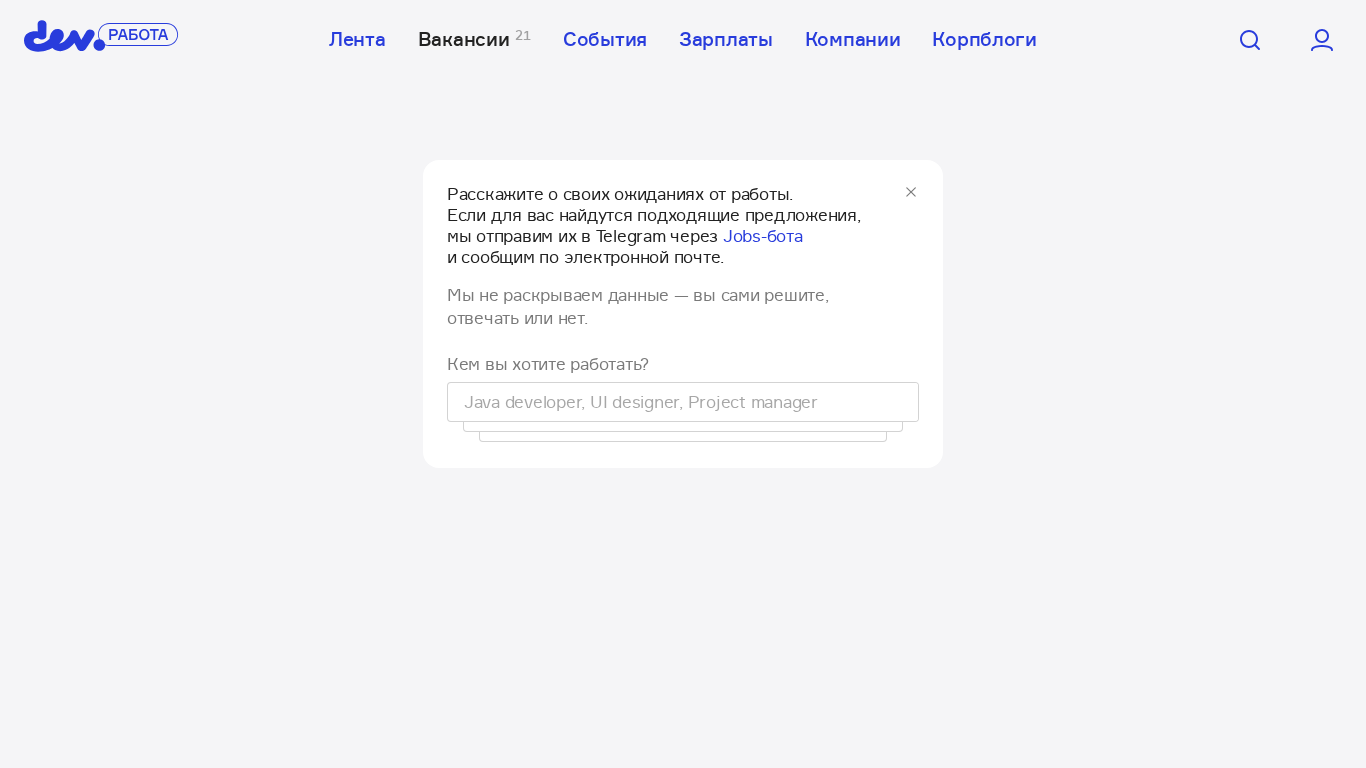 | SEO-описание | Найти работу в IT. Поиск работы для программистов — 21 вакансия для разработчиков Java, Android, iOS, C/C++, Python, PHP, тестировщиков, бизнес-аналитиков, менеджеров, маркетологов. |