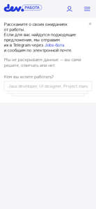| AI-анализ | The web project "IT-вакансии в Беларуси — поиск работы для программистов и ИТ-специалистов на jobs.dev.by" is a Belarusian job board dedicated to IT professionals. The site offers a vacancy list with 21 job openings in various IT fields, including Java, Android, iOS, C/C++, Python, PHP, testing, business analysis, management, and marketing. Users can filter vacancies by specialization, location, company type, and size. The site also includes a corporate blog and an events section. The site does not reveal any contact information, but users can apply for jobs through the Telegram bot and receive responses via email. Companies listed include Centaurea, Belhard, and UpsilonIT. Vacancies range from junior to senior levels and offer various remote and on-site work options, with |