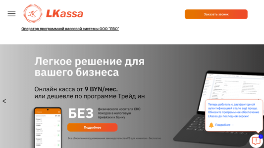 | AI-анализ | --- The portal lkassa.by is an online programmable cash register system operated by OOO "ЛВО". It offers easy registration and low tariffs starting from 9 rubles per month. The system supports trade, public catering, and service industries, and allows for differential data processing and marking of goods. It integrates with the Oplati payment system and offers operational technical support. LKassa is a programmable cash register system with a simple interface, automatic free updates, and support for the marking of goods. It is ideal for retail and wholesale trade, public catering establishments (excluding restaurants and cafes with table service), and service industries. It supports transactions for the registration of cash withdrawals for the issuance of cash to the holders of banking payment cards. The system requires an internet connection to function. Benefits include low cost, flexible tariff plans |