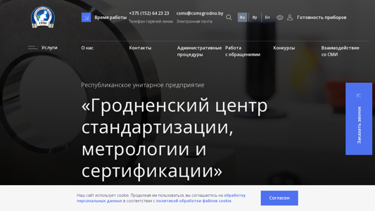 | AI-анализ | --- The portal <title: Республиканское унитарное предприятие «Гродненский центр стандартизации метрологии и сертификации»> (csmsgrodno.by) is an official website for the State Unitary Enterprise "Grodno Center for Standardization, Metrology and Certification" in Belarus, located in the city of Grodno. The main activities of the center include metrological evaluation of measuring instruments, metrological audit, sales of measuring instruments, confirmation of product and service compliance (certification and declaration), assessment of management systems, information support for enterprises and distribution of their changes (officially), testing in accordance with the accreditation area of testing laboratories, and provision of engineering and technical services, commissioning works, and organizational and methodological assistance to enterprises in their participation in various contests and quality |