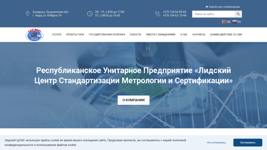 | AI-анализ | The web project "РУП "Лидский центр стандартизации, метрологии и сертификации" (Lidsky TsMS) is a Belarusian .BY domain dedicated to a state center for standardization, metrology, and certification located in the city of Лида, Гродненская обл. The website includes information on their various activities, which involve overseeing the adherence to standards, metrological rules, and norms. The site uses cookies during visits and requires consent to its privacy policy. The contact details provided include a phone number and two different addresses. The domain name is csmslida.by. |