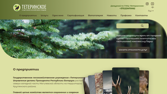 | AI-анализ | The portal is a governmental forestry organization named "Тетеринское" under the Management of Affairs of the President of the Republic of Belarus. It is located in the northwestern part of the Mozyr District in Kruglyansk District. The primary objective of the organization is to preserve and create high-yielding, biologically sustainable forests, meeting contemporary ecological, social, and economic needs. The activities focus on enhancing forest productivity through improved forest management practices, forest age balance, optimal tree species diversity, and forest creation. The organization offers various services including tourism, hunting, fishing, and accommodation. The website provides information on vacancies, the 2025 development plan, administrative procedures, and certifications. It also features an electronic application system, written inquiries, and news updates. The organization is PEFC certified. The contact for the organization is +375 22 |