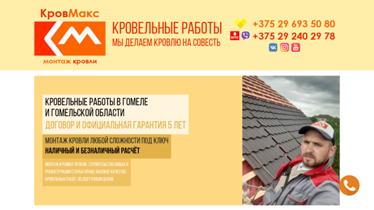 | AI-анализ | This website is about roofing services in the city of Homel, Belarus. The title is "Кровельные работы в Гомеле. Монтаж кровли Гомель" which translates to "Roofing works in Homel. Roofing Homel". The description includes various roofing services such as installation of mansard windows, water drainage systems, and underlayment. The website offers high-quality and quick services, as well as insulation and repair of roofs. The company name is "Кров Макс" and they provide roofing services in Homel and the Homel region. The contract includes a five-year warranty and they offer both cash and non-cash payment options. The website lists various roofing services, including the installation of roof structures, insulation, and the construction of carport homes. The company also offers the installation of m |