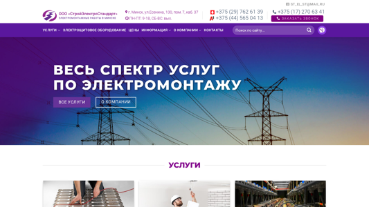 | AI-анализ | --- The portal StroyElectroStandard offers electrical installation services in Minsk, Belarus. The company specializes in various types of electrical work for both physical and legal entities. They provide both full-scale services "turnkey" and individual electrical installations. Key services include electrical wiring, lighting installation, transformer substations, cable repair, and more. The contact information is provided, including phone numbers and an option to request a call. |