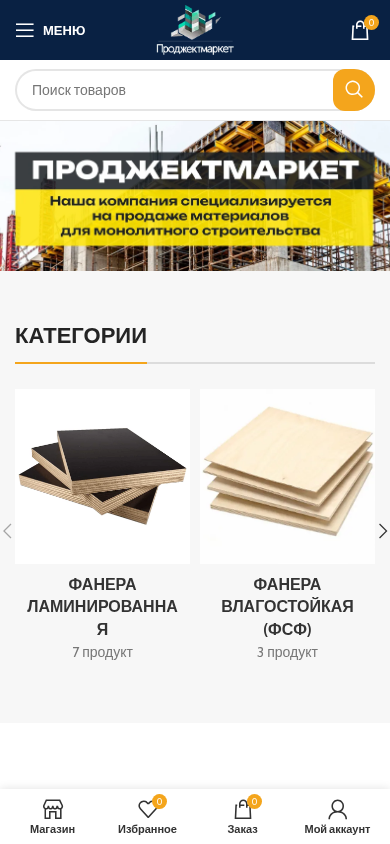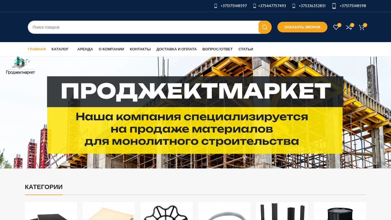 | SEO-описание | ПРОДЖЕКТМАРКЕТ – продажа стройматериалов, ламинированной фанеры, комплектующих для опалубки. Широкий ассортимент, выгодные цены, доставка по Минску. |