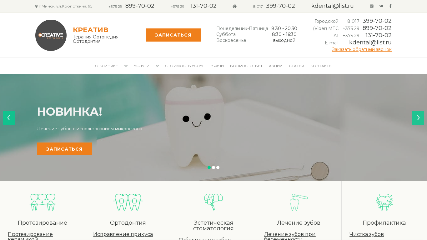 | SEO-описание | Все виды стоматологических услуг: лечение, имплантация, виниры, брекеты, профгигиена. Частное предприятие Креатив. |