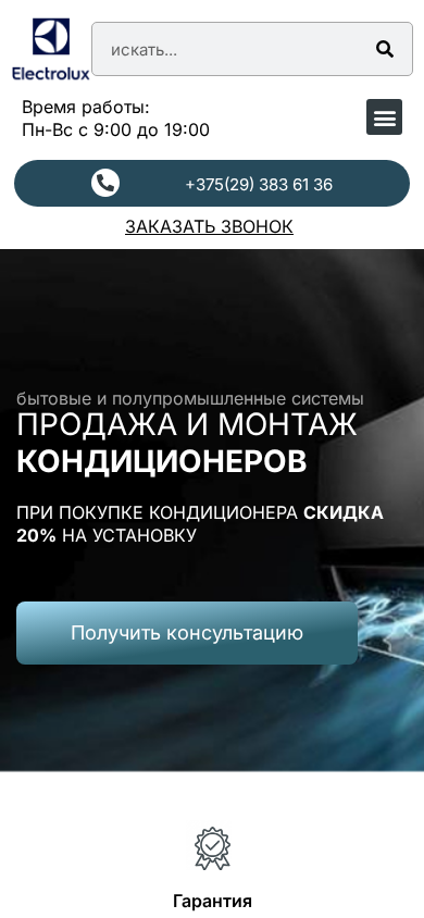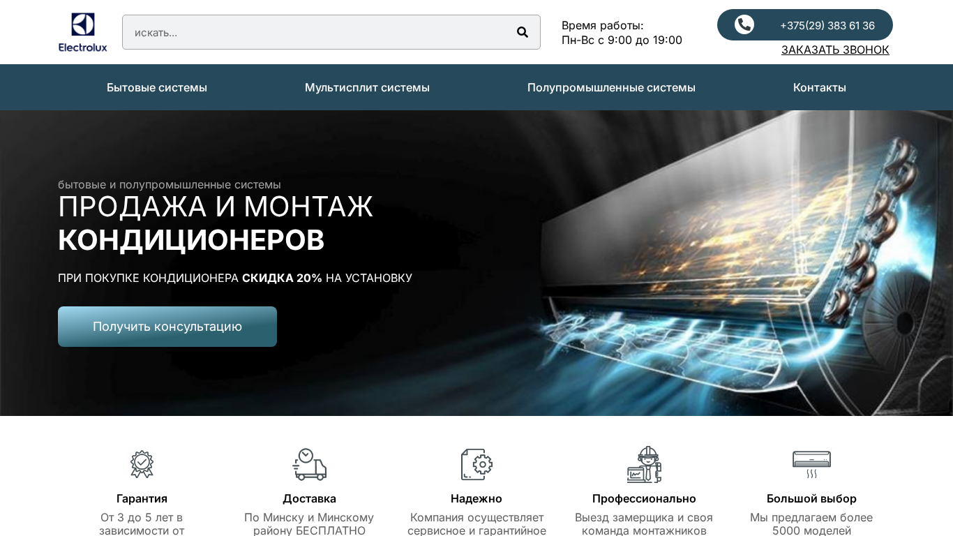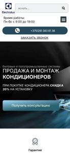 | AI-анализ | --- The web project "Electrolux Belarus" is a home appliance e-commerce platform focusing on the sales of air conditioning systems and related services in Belarus. The site offers various types of split-systems, including inverter and on/off models, as well as multi-split systems and a wide range of blocks for purchase. The company guarantees quality services and affordable prices, with contacts provided for inquiries and orders. The site also features a menu for easy navigation, with sections for inverter, on/off, and multi-split systems, as well as blocks and contacts for purchasing and service inquiries. The company offers a 20% discount on installation with a purchase and provides a warranty of up to 5 years depending on the manufacturer, as well as delivery within Minsk and the Minsk region for free. The site also provides professional installation services, with a team of |