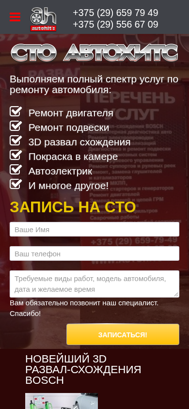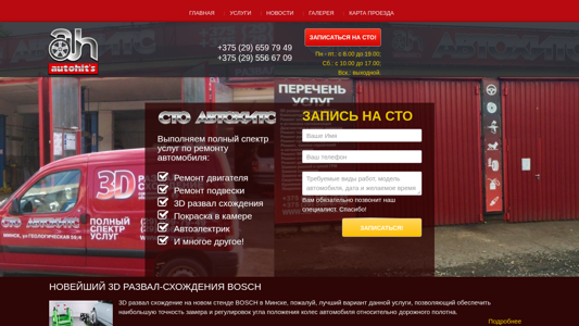 | AI-анализ | The website is a car repair service in Minsk, Belarus, called STO Autohits. The description mentions 'comprehensive repair and maintenance of cars at a modern auto service in Minsk at attractive prices'. The top keywords are 'repair car in Minsk', 'car repair', 'auto service', and 'STO'. The website offers a range of services including engine repair, suspension repair, painting, auto-electrics, and more. Users can book a service appointment by phone, and the website provides information on the types of repairs and the model of the car required. The website also mentions a new 3D alignment service using Bosch technology. The services offered are listed in detail, including engine repair, suspension repair, and various other repair and maintenance options. The website also mentions a financing option using a 'Халва' card from MTBank. |