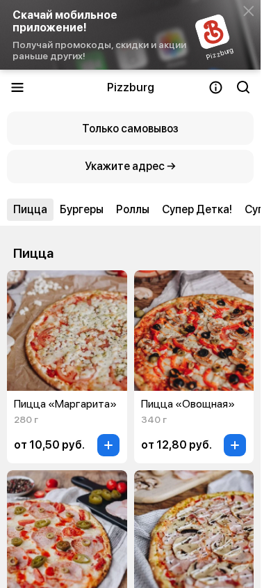 | AI-анализ | --- The website Pizzburg Гомель offers a menu that may vary depending on the delivery address. Please specify your address for accurate information. The operating hours are from 11:00 to 21:30. The website features menus for pizza, burgers, rolls, soups and salads, garnishes and appetizers, sauces, cold beverages, pies, cakes, and baked goods. Menu items include classic "Маргарита" pizza with tomatoes, basil, and Mozzarella cheese; "Овощная" pizza with vegetables, olives, and tomatoes; "Дьябло" pizza with meat, peppers, and sauces; and "Бульбаш" pizza with sausages, bacon, and potatoes. Prices range from 10.50 to 17.5 |