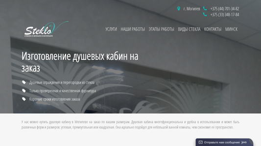 | AI-анализ | The web project "Steklov.by" is a website based in Могилев, Belarus, showcasing and selling custom-made glass shower cabins and glass products. The site offers various glass works such as mirror tiles, mirror panels, and various glass items. Users can contact the company by calling +375 (44) 701-34-82 or +375 (33) 348-17-84. The site provides information on their services, which include glass doors, glass partitions, and custom-made glass cabins for bathrooms. They also offer various types of glass, including tempered, colored, satin, and laminated glass. The site highlights their exclusive designs and the benefits of their products, such as quick production times and high-quality fittings. Users can view their portfolio, request a quote, and find |