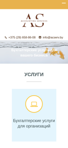 | AI-анализ | The website is a Belarusian accounting services provider, specializing in both organizational and individual clients. The title of the website is "Бухгалтерские услуги" (Accounting Services) and it offers comprehensive bookkeeping and tax consulting services, including tax return preparation, tax reporting, payroll processing, and financial statement preparation. The website also offers assistance with the opening of new businesses and the development of local legal regulations. It features sections for organizational and individual clients, with separate services for each. The contact information includes a phone number (+375 29 658-86-08) and an email address (info@acserv.by). The website is available at acserv.by. |
