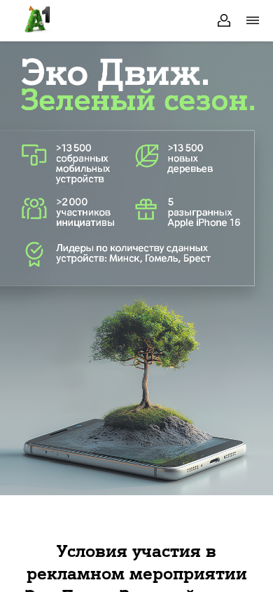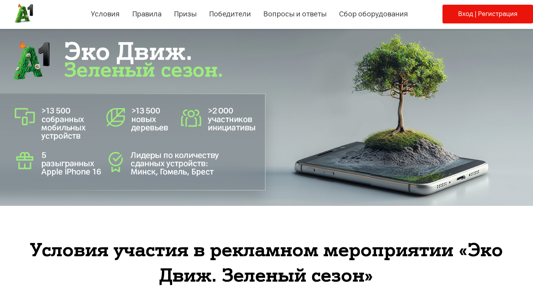 | AI-анализ | --- The web project "Re.a1.by" is dedicated to a promotional event named "Эко Движ. Зеленый сезон" (Eco Driving. Green Season). During this event, participants can register on the website and bring their used mobile devices, such as telephones, tablets, smartwatches, or e-books, to any A1 store. In exchange for their devices, they will receive unique participation codes which they must activate in their personal account on the website. Five Apple iPhone 16 128GB smartphones are being raffled off among the participants. The winners will be announced on March 20, March 27, April 3, April 10, and April 17, 2025. Participants can find answers to their questions on the website. To take part in the event, they need to |