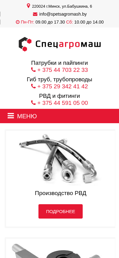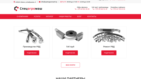 AI-анализ | The web project 'Спецагромаш' is a company based in Minsk, Belarus, specializing in the production, repair, and sale of high-pressure hoses, fittings for RVD, tubing connections, and silicone pipes. The company offers various hydraulic components and provides services related to their installation, maintenance, and repair. The contact information includes phone numbers for different departments: +375 44 703 22 33 for patrubkis and paipingi, +375 29 342 41 42 for gib tubes and tubing systems, and +375 44 591 05 00 for RVD and fittings. The website also includes a blog, company information, and contacts. The domain is spetsag |