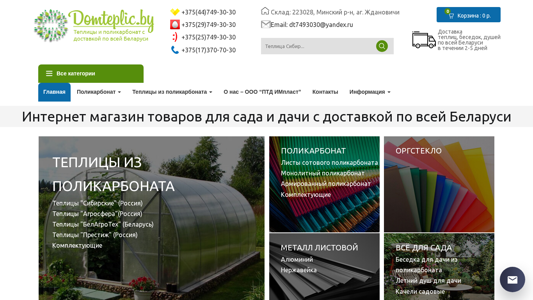 | AI-анализ | --- The portal "Domteplic.by" is an e-commerce website specializing in the sale of polycarbonate and metal structures in Minsk, Belarus, with delivery available nationwide. The company sells polycarbonate, organic glass, and sheet metal. The website features various categories of products, including greenhouses, all for the garden, and metal structures. The main categories are polycarbonate, with subcategories for greenhouses, and metal structures, with subcategories for all types of metal sheets. The company also offers various brands, such as "Сибирские теплицы" (Belarus), "Агросфера" (Russia), "БелАгроТех" (Belarus), "Престиж" (Russia), and "Урожай" (Russia). The website provides information |