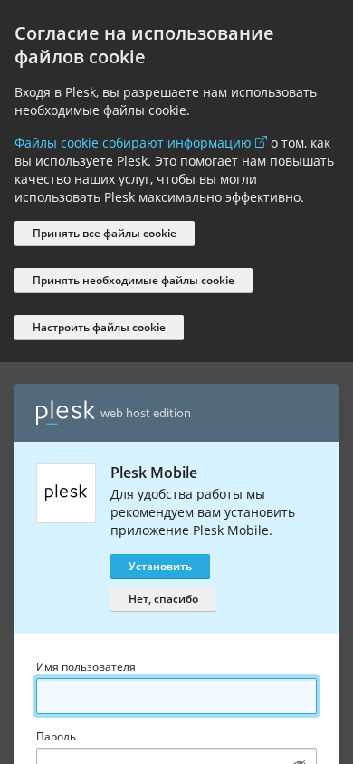 | AI-анализ | The website 'gruzchiki24.by' is a Plesk-powered platform for managing web hosting services. Users of the site must consent to the use of necessary cookie files during login to Plesk. The cookies collect information about how users interact with Plesk to improve the quality of services and enable more efficient usage. Users can opt to install the Plesk Mobile app for convenience. Upon logging in, users are prompted to enter their username and password. There is also a forget password feature. The site's cookie policy is outlined within Plesk. |