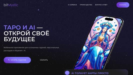 | AI-анализ | The website bytMystic — bitMystic is a mobile application offering personalized Tarot readings, intelligent interpretations, and communication with an AI. Users can start a Tarot reading and download AI to interpret cards, focusing on self-understanding and introspection. The AI provides clear and accurate interpretations, allowing users to delve deeper into their questions and situations without losing the traditional magic of Tarot. The service includes features like a question-and-answer system, saving and analyzing past readings, and daily rituals for mindfulness and inner balance. The interface is user-friendly, and the mobile format enables Tarot readings on the go. BytMystic — bitMestic's Tarot readings with AI integration aims to help users concentrate on their questions while the app provides insights using cards, technology, and intuition. |