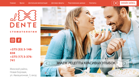 | SEO-описание | Стоматологическая клиника в Минске al DENTE, расположена в современном районе Новая Боровая, семейная стоматология оказывает весь спектр стоматологических услуг. |