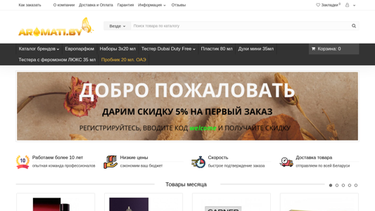 | AI-анализ | --- The web project "Internet-magazine of perfumery" is an online store selling perfumes for women and men in Belarus. It offers a wide range of licensed fragrances at affordable prices, with a large catalog of aromas and toilet waters. The store provides free shipping upon reaching a certain order amount and offers discounts for regular customers. Customers can place orders and make payments online, with delivery throughout Belarus. The company has been in operation for over 10 years and boasts a team of experienced professionals. The site features a catalog of brands from Europarfüm, as well as various sets and individual perfume testers. Products include Dubai Duty Free items, plastic bottles of various sizes, mini perfumes, and testers with pheromones. The site has a shopping cart with zero items and offers fast order processing. Popular brands and products include Christian D |