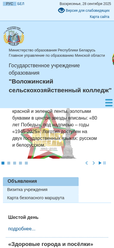 | AI-анализ | The portal "Воложинский СХПЛ" (Volozhinsky SXPL) is an educational institution website under the Ministry of Education of the Republic of Belarus, located in the Minsk region. The website provides information about the Volozhinsky Agricultural College, its administrative procedures, contacts, and various services offered. The site includes sections on admission, fees, accommodation, and educational programs for students, as well as information on the college's history, achievements, and policies regarding personal data protection. The website also features interactive elements such as an electronic application system and electronic textbooks. Additionally, it provides information on the college's partnerships, legal frameworks, and inclusivity initiatives. The site is available in both Russian and Belarusian languages. |