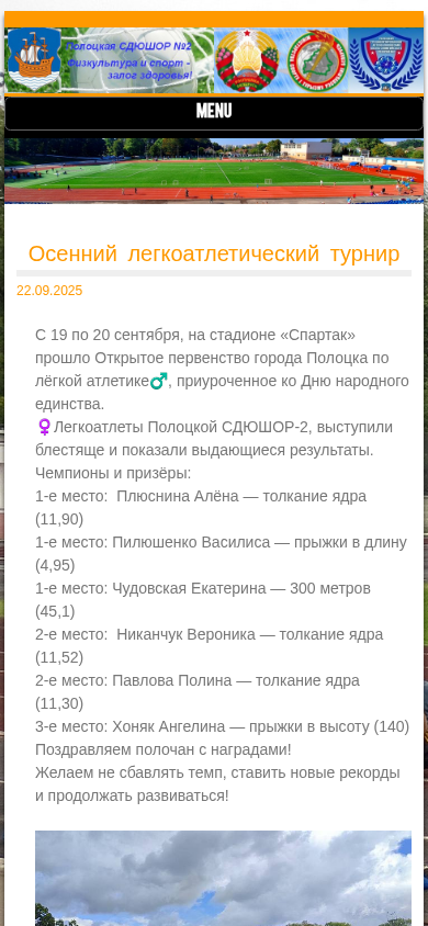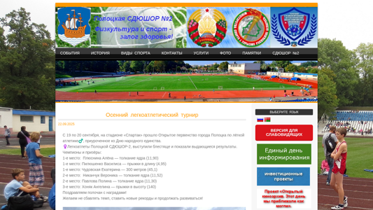 | AI-анализ | The web project "Polockaya SDYSHOR #2 | Fizkul'tura i sport - zalog zdrav'ya" is a sports school website for the second district of Polotsk, Belarus. The title suggests that it offers physical education and sports as a means of promoting health. The description mentions several sports, including individual track and field events, basketball, football, boxing, weightlifting, and cross-country skiing. The website includes sections for events, history, types of sports, contacts, services, photos, memories of the school, and the school's constitution. The top words suggest that the website contains information related to the months of September, May, and various years from 2016 to 2025. The website also includes a section for documents. The most recent updates on the website include news about a successful athletics competition in |