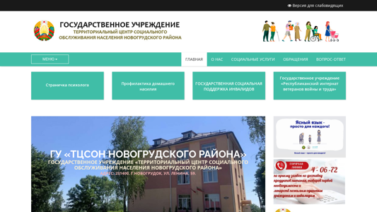 | AI-анализ | The website is the official page of the Territorial Center for Social Services of the Novogrudok District in Belarus. It provides information about the various social services offered by the organization, including primary reception and analysis, comprehensive support in crisis situations, social assistance at home, social rehabilitation and support for the disabled, and residential care for the elderly and disabled. The website also offers a regional social services map for seeking various types of assistance and support for families raising disabled children, guardianship and foster care, social services, and a page for social services, as well as a news section and a dialogue platform for older people and young people. The website is located at the address: 231400, g. Novogrudek, ul. Lenina, 59. The domain is novtcson.by. |