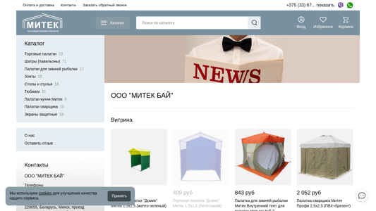 | AI-анализ | This website belongs to OOO "MITEK BAY," a Belarusian company producing caravan-tent products, with an office in Minsk. The site offers detailed information about the company and its products. It includes a catalog featuring various types of tents and covers for construction, industrial, commercial, and recreational use, such as trade pavilions, garages, event tents, fishing tents, and swivelers' tents. The company offers both standard and custom-made products. The site includes sections for product orders, customer service contacts, and a catalog. The production is carried out in a modern facility equipped with advanced technologies, including a metalworking shop, a painting shop, and a sewing shop. The company provides an option to add a client's logo to the tents using sublimation printing, ensuring longevity and vibrancy. |