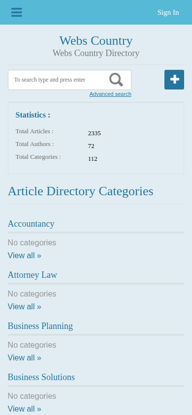| AI-анализ | This website is a country directory named Webs Country with the domain name webscountry.com. It features a Webs Country Directory section that allows users to browse and search for businesses, services, and articles across various categories, including accounting, attorney law, business planning, business solutions, and many others, totaling 112 categories. The directory offers advanced search functionality, enabling users to filter results based on specific criteria. The website also has a Guest Post and Add My Site feature for contributing content, as well as a Contact Us, FAQs, and Sign In page for user interactions. The website was last updated on September 26, 2025. |