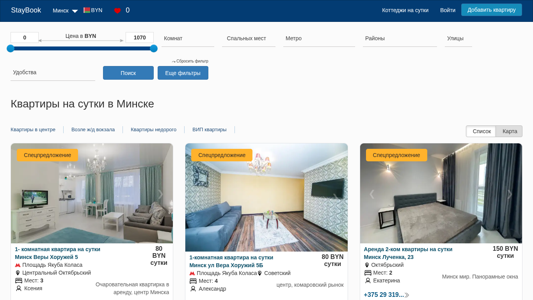 | AI-анализ | --- The web project "Sutki24.by" is a platform for renting apartments in Minsk, Belarus, on a daily basis directly from the property owners. Users can access a wide range of one- to ten-bedroom apartments located in various districts of the city, including Central, Moskovsky, Sovietsky, and others. Prices start from 40 BYN ($21.95). The website also includes a filter for sorting listings by price and number of bedrooms. A section for apartments with specific amenities, such as a balcony, oven, or parking space, is also available. |