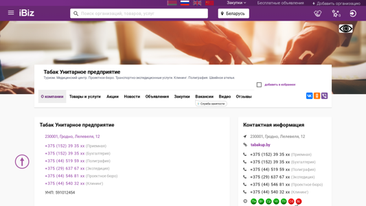 | AI-анализ | --- The website is for Tabak Unitarnoe Predpriyatie, a company located in Grodno, Belarus, at the address 230001, Leleveya 12. The company offers various services and products including tourism, a medical center, project bureau, transport-expedition services, clinging, printing, and sewing atelier. Contact information for the reception, accounting, printing, expediting, project bureau, and clinging departments are provided. The company's Unified State Register number is 591012454. A map and instructions for reaching the company are also available. The website is in Belarusian language and is accessible via tabakup.ibiz.by. Business hours are Monday to Friday, 9:00 AM - 6:00 PM, with Saturdays and Sund |
