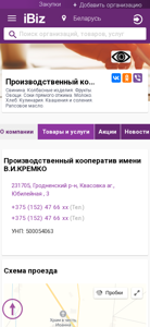 | AI-анализ | This website is a production cooperative named after V.I. KREMKO - Svinina, offering various products such as sausages, fruits, vegetables, freshly squeezed juices, milk, bread, kitchenware, fermented foods and soy sauce, and rapeseed oil. The address and contact telephone numbers are provided. The company's UNP (Unified State Register of Legal Entities) number is 500054063. The website includes sections for company information, products and services, news, vacancies, and contact details. |