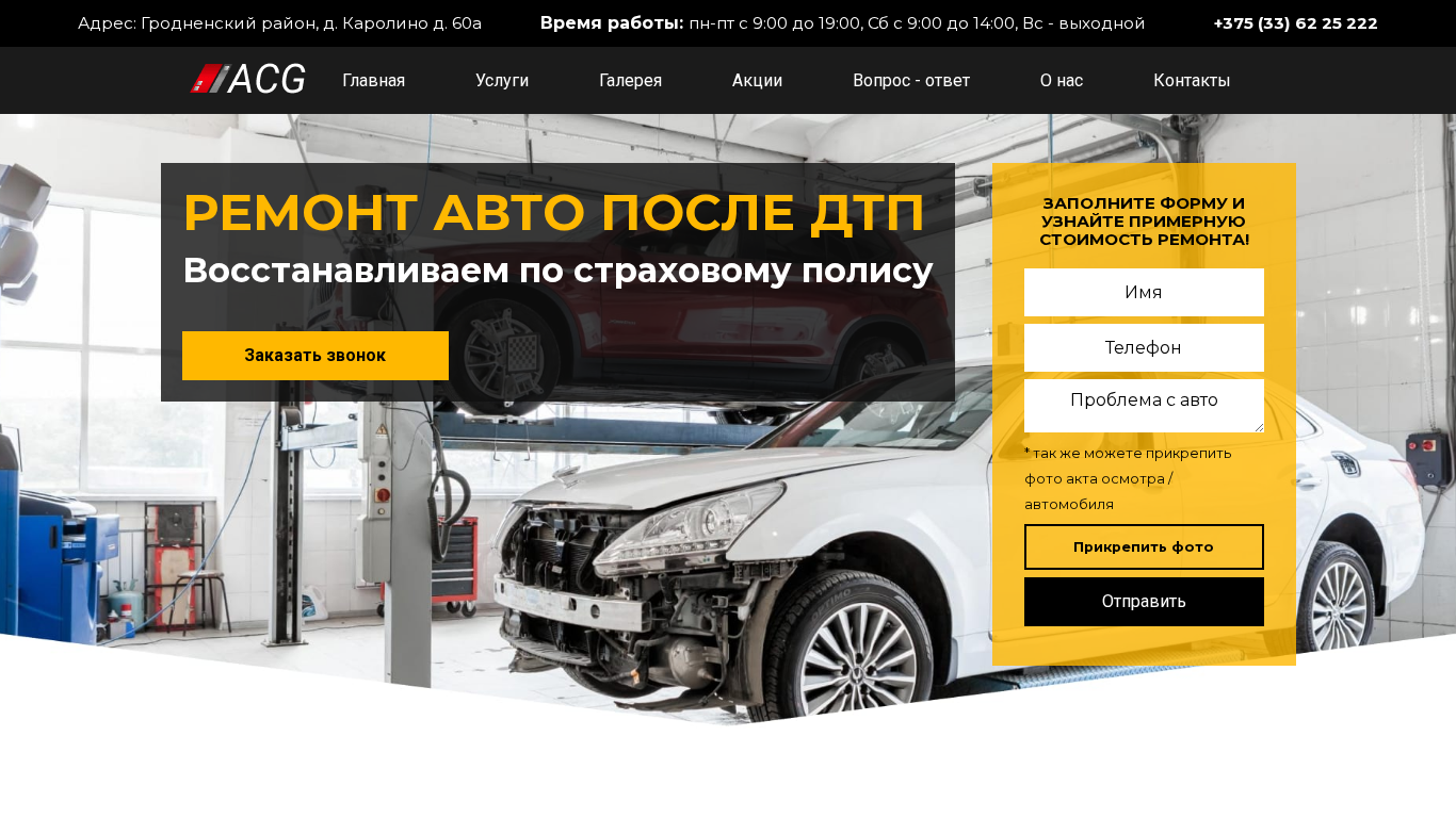 | AI-анализ | This website is an auto repair and restoration service called ACG Ремонт Кузова После ДТП, located in the Grodненsky district, d. Karolino 60a. The business operates Monday to Friday from 9:00 to 19:00 and Saturdays from 9:00 to 14:00, with a phone number of +375 (33) 62 25 222. The site's title is "ACG Ремонт Кузова После ДТП" and its description contains keywords like "ремонт" (repair), "авто" (car), "автомобиля" (vehicle), "покраска" (paint), "замена" (replacement), and "бампера" (bumpers). The most frequent words |